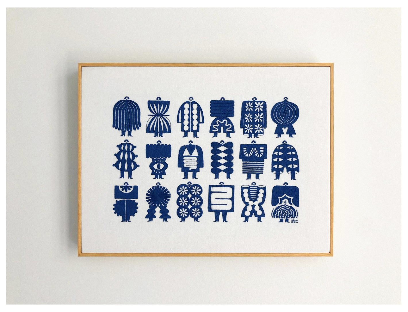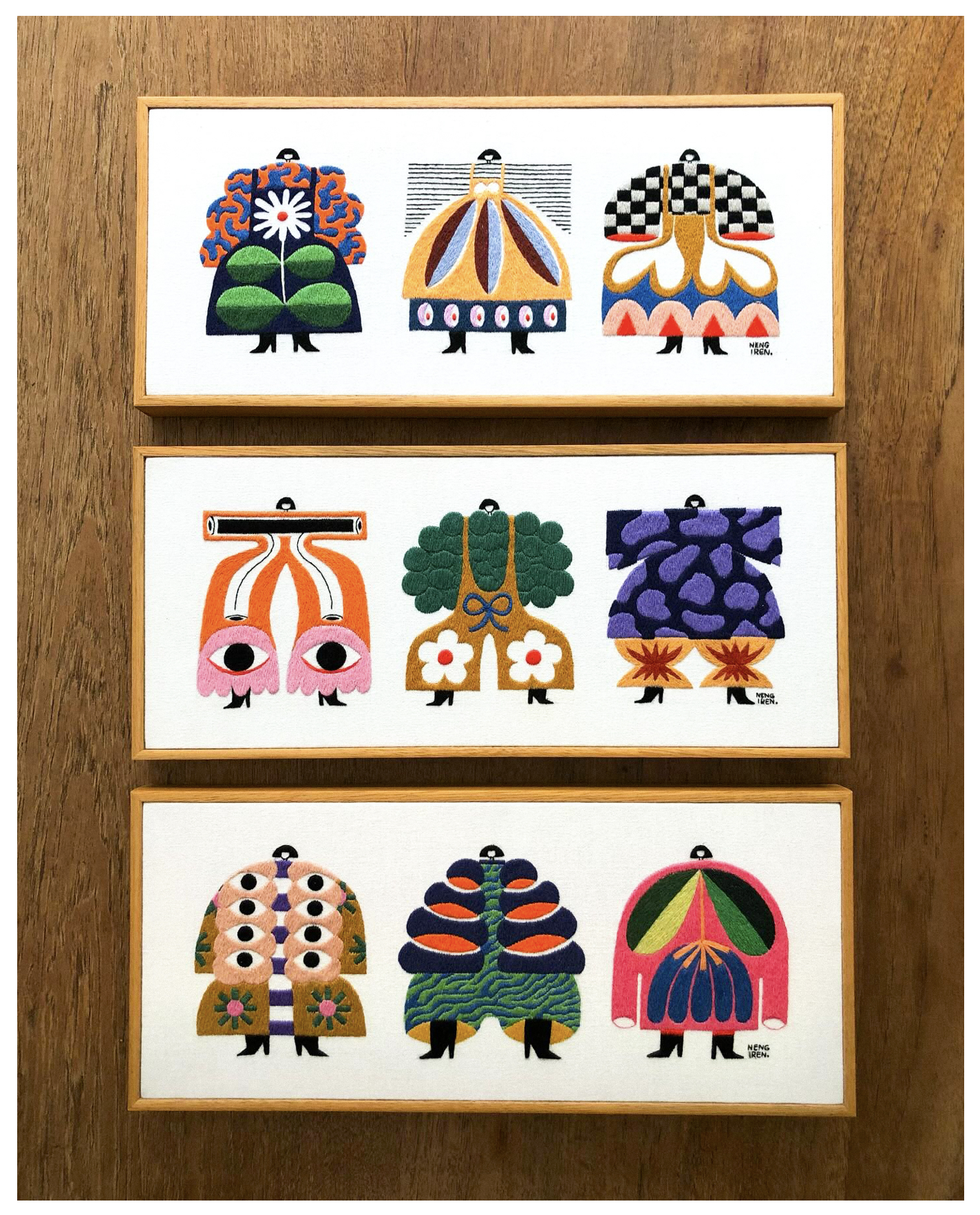 當一根緞面繡線在棉布上蜿蜒,勾勒出娃娃領(lǐng)的弧度;當幾何色塊與鮮艷針腳碰撞,撐起一件迷你裙擺 —— 印尼藝術(shù)家 Irene Saputra(藝名 Nengiren)正用最傳統(tǒng)的刺繡工藝,做著最時髦的 “角色穿搭實驗”。她筆下的 “nona kecil”(印尼語 “小女孩”)系列,不是靜態(tài)的玩偶,而是每天都有新造型的 “時尚 Icon”,在針與線的交錯間,完成了手工藝與現(xiàn)代時尚的溫柔對話。